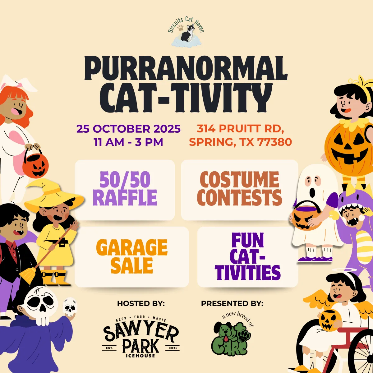 Join us at Sawyer Park Icehouse on Oct 25th, from 11 AM –3 PM for Purranormal Cat-tivity, a Halloween fundraiser benefiting Biscuits Cat Haven .
